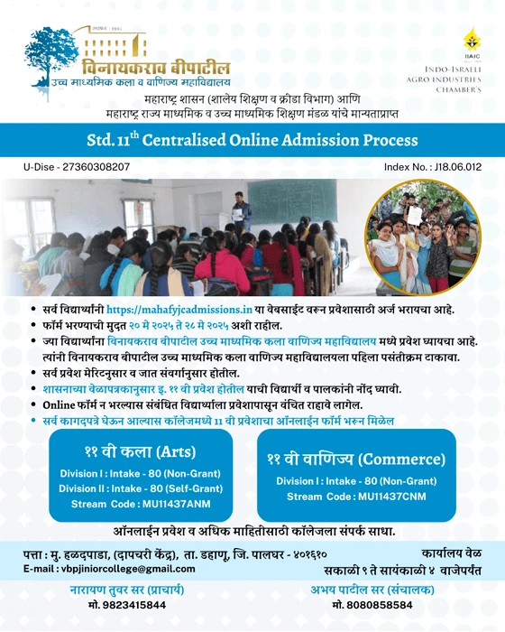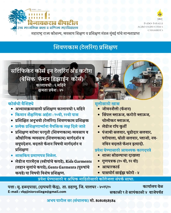 तसेच संस्थेने कृषी माहिती व व्यापार तंत्रज्ञान महाविद्यालय (स्थापना- २००७-०८) मध्ये विविध प्रकारचे १० कौशल्यवृध्दीव्दारे कुशल मनुष्यबळ निर्मितीचे शासनमान्य पार्टटाईम प्रशिक्षण ६ महिन्याचे कृषी विभागांशी निगडीत कोर्स प्रशिक्षणामध्ये प्रवेश घेता येईल. संस्थेच्या कृषी शासनमान्य प्रशिक्षणामध्ये प्रवेश घेतल्यास त्याला संस्थेच्या योजनेच्या आधारे इ. ११वी व इ.१२ वी उत्तीर्ण मुलांना रोजगार- स्वंयरोजगार देण्यात येणार असून आदिवासी भागातील मुलांचे राहणीमान सुधारून आर्थिक लाभ मिळणार आहे. असे दोन्ही शैक्षणिक लाभ प्रवेशार्थांना मिळणार आहे. तसेच महाराष्ट्र शासनाने जूलै २००८ मध्ये संस्थेस विनायकराव बीपाटील कला व वाणिज्य कनिष्ठ महाविद्याल (वि. अ.) तत्वावर मान्यता देण्यात आली असून विद्यार्थी इयत्ता ११वी / १२वी कला व वाणिज्य शाखेचे शिक्षण घेत आहे. तसेच संस्थेने विनायकराव बीपाटील व्यवसायिक अभियांत्रिकी व कौशल्यवृध्दी महाविद्यालय सन २०१२-१३ संस्थेने व्यवसाय शिक्षण परीक्षा मंडळाचे २ वर्ष कालावधीचे अभ्यासक्रमांना उच्च शिक्षणासाठीचे + २ स्तराची समकक्षतेचे ६ व्यवसायिक अभियांत्रिकी व कौशल्यवृध्दी अभ्यासक्रम सुरू केले आहे. याव्दारे आपल्याला रोजगार-स्वंयरोजगाराच्या हमीवर शासनमान्य प्रशिक्षण देण्यात येणार आहे.
