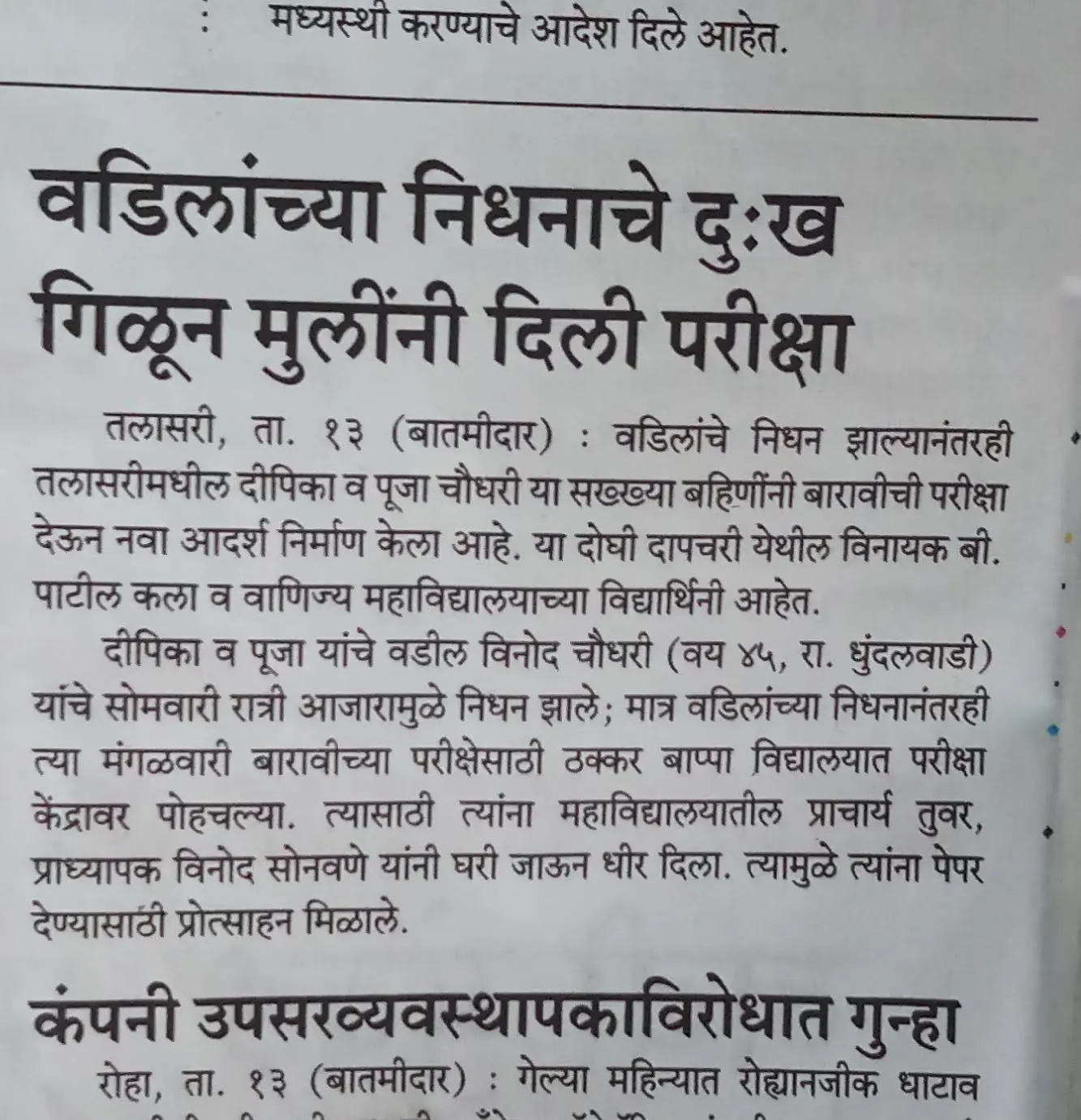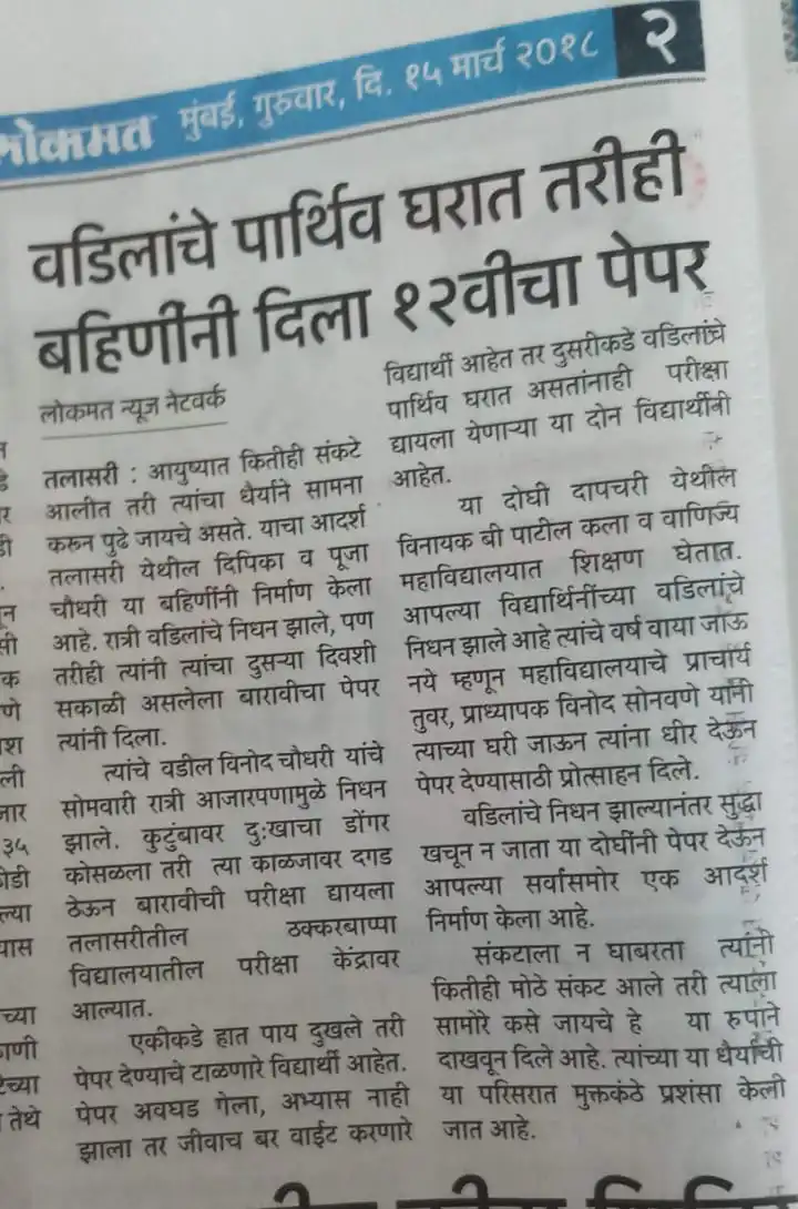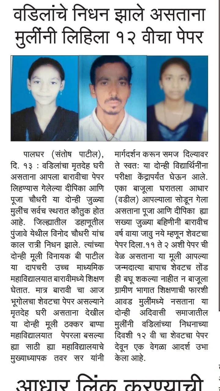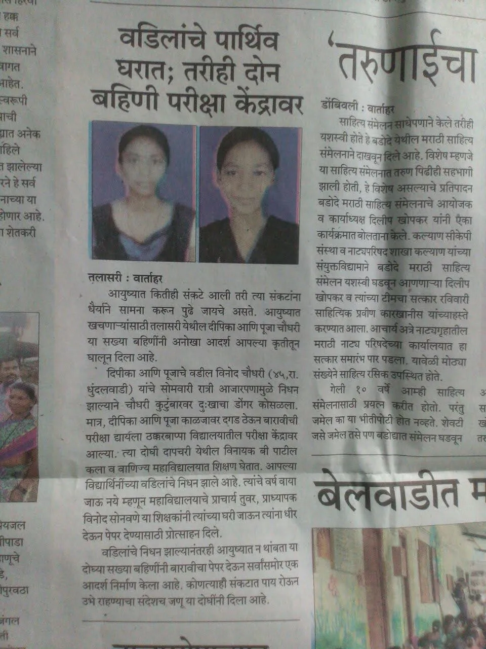 बातम्या आणि कार्यक्रम Annual Day Celebration 2018-19 वडिलांच्या निधनाचे दु : ख गिळून मुलींनी दिली १२वीची परीक्षा विनायकराव बी पाटील महाविद्यालयाकडून भूकंप जनजागृती परिसंवाद विनायकराव बी पाटील महाविद्यालयातील कला क्रिडा सप्ताह, वार्षिक पारितोषिक व गौरव सोहळा तंबाखूजन्य अंमली पदार्थविरोधात जनजागृती, लसीकरण व महिला आरोग्य शिबीराचे आयोजन मतदार नोंदणी अभियान रस्ते सुरक्षा अभियान